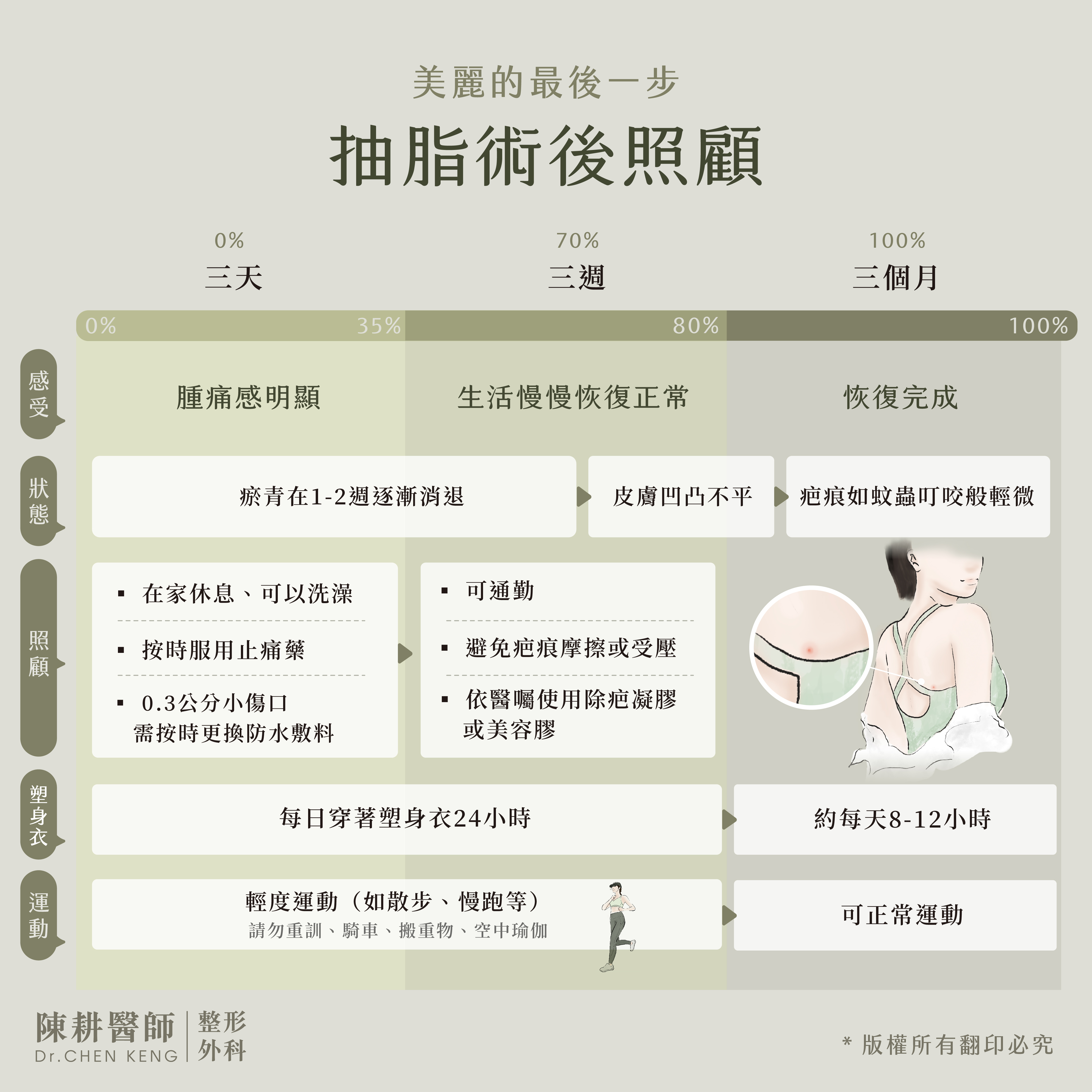 抽脂術後,恢復期可分為「三天、三週、三個月」三階段。