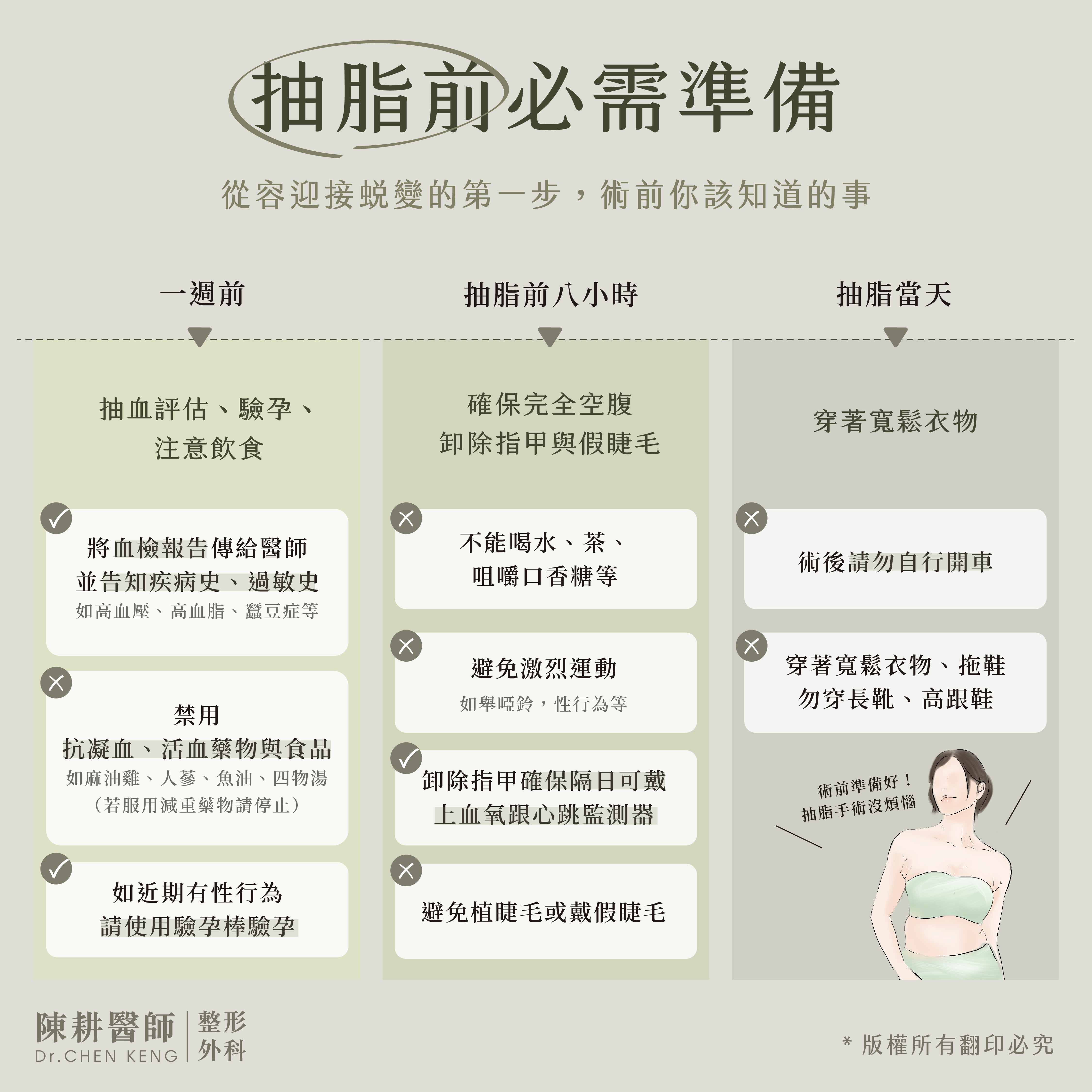 抽脂需要全身麻醉,為了確保全程舒適與安全,在全身麻醉前需要抽血報告、驗孕,還有一系列必須得注意的事項,透過下面這張表格,讓你一次掌握,有效降低全身麻醉的風險。